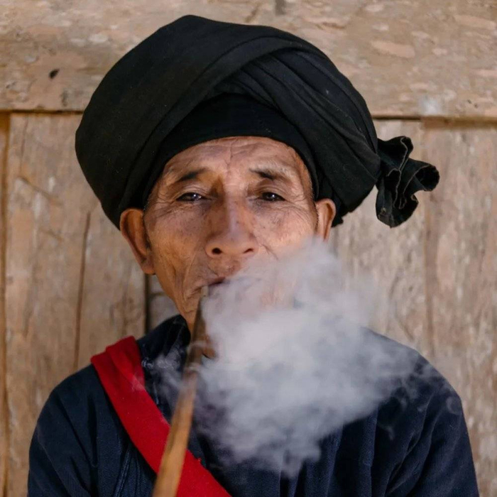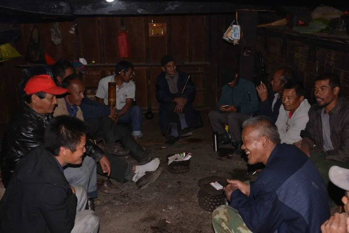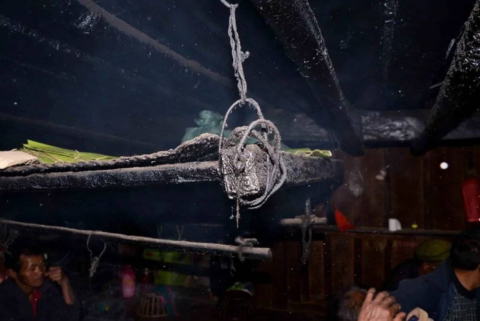 那户人家刚刚新出生了一个孩子,按惯例,要邀请魔巴为新生儿祈福,大家就在寨子里的老屋,围着火炉,男的在前,女的在后,大家都同时做着一个动作,用一个手撑着自己的头,当魔巴开始念经文的时候,大家也会跟着念,因为坐的板凳很低,屋内灯光也昏暗,你会觉得好像所有人都在沉思,好像等着魔法降临,所有人进入到一种冥想的状态。