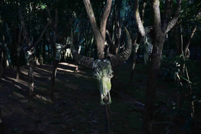 佤族一般依山而居,有自己的神山,他们会定期祭拜,那是一片非常茂盛的森林,树木丛生,树桩上挂着野生牛头,非常神秘,甚至感觉到有点恐怖,把这些牛头挂在村外,就像是古代城墙上的示众一样,是一种防护的标记。