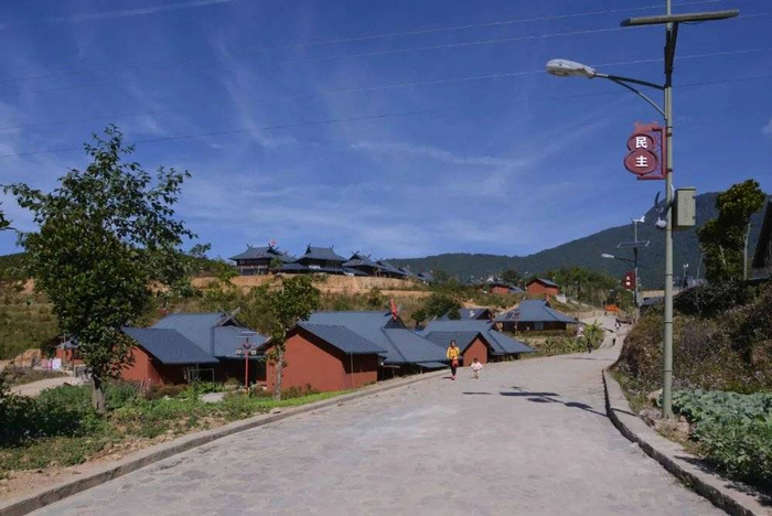 新村和老村隔了一公里,走过去的时候感觉新村和老寨子完全不同——进老寨子的路是石头路,两边有很深很茂密的林子;去新村时,路上有崭新的路灯,刷着鲜亮的标语,连牛头都是新的,你会觉得它跟我们普通的农村没有什么区别。