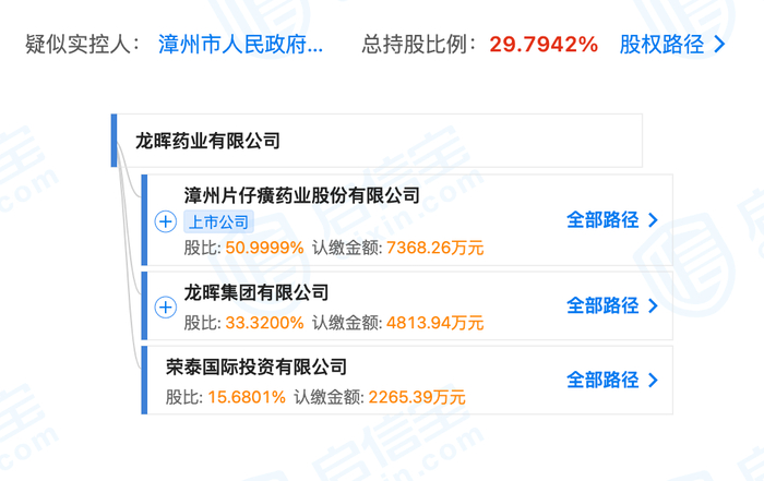 值得一提的是,注册资金高达1.44亿元的龙晖药业,其最大的股东为A股上市药企片仔癀(600436.SH),持股比例为51%。