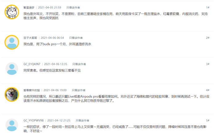 在三星手机官方粉丝论坛“中国盖乐世社区”上,有网友于4月5日发布的一篇帖子反映了关于Galaxy Buds Pro耳帽材质导致的外耳炎问题。该网友称,“buds 我用了一年,live用了半年多,平时除了上班和睡觉基本都带耳机(尤其打游戏),但今天我翻车了,一直以为pro作为前面二者最强旗舰,防水还有空间环绕用料应该挺可以,没想到倒在了耳帽上。”