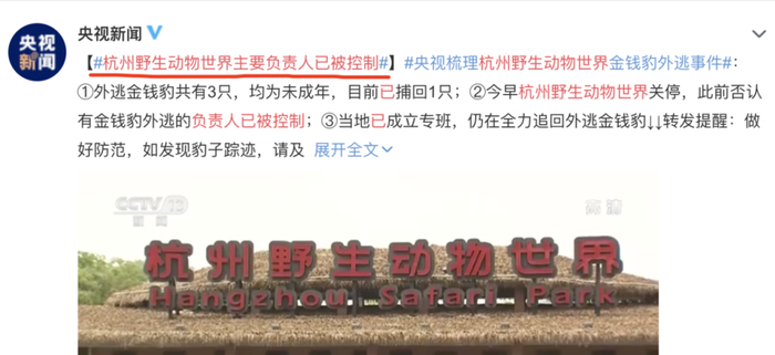 17时38分,富阳市政府发布信息称:17时许在富阳区银湖街道金苑山庄旁边山林发现并成功麻醉捕获一只从杭州野生动物世界逃脱的未成年金钱豹。
