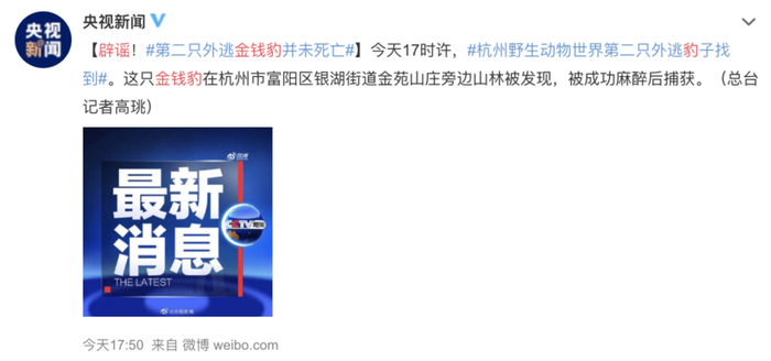 央视新闻等媒体发布辟谣,声明“第二只金钱豹并未死亡”。
