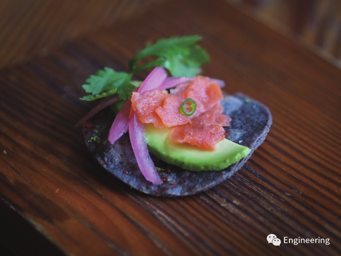 图1. 这道开胃菜是将鲑鱼肉切成薄片,然后放在紫色玉米饼上,再配上牛油果、腌洋葱和香菜。这道菜是美国俄勒冈州波特兰市一家餐厅在2019年6月举行的品尝晚宴上推出的一道菜。在实验室培育了数周的500g鲑鱼肉成为了这道菜的亮点。注:资料来源:Wild Type,经许可“品尝了鲑鱼肉的客人告诉我们,人工鲑鱼肉在质地、风味和外观上已经非常接近他们最喜爱的鲑鱼肉料理了”,总部位于美国旧金山的实验室人工培养鲑鱼肉的初创公司Wild Type的联合创始人Justin Kolbeck说,“准备食物的三位厨师认为,我们的鲑鱼肉非常适合用于烹饪寿司卷、酸橘汁腌鱼等多种传统美食。”