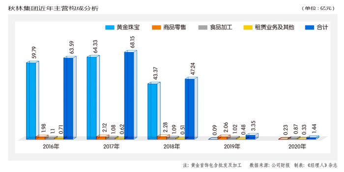 2015年该笔重大资产重组完成,秋林集团在原有主营业务秋林百货零售、秋林食品生产与销售、彩宝批发销售基础上,新增黄金制品、珠宝首饰的设计、加工和批发业务。黄金资产的注入让秋林股份的经营规模快速扩大,让秋林股份的营业收入从2013年的3.81亿元上升至2014年(调整后)的44.2亿元,告别此前的个位数营收,但这一新业务,是导致秋林集团沦落到要被终止上市的关键性因素。