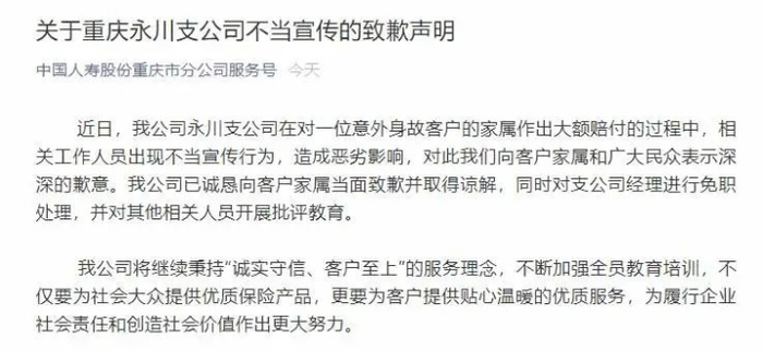 但凡完整接受过九年义务教育的正常人,谁能搞出来这么一出?谁知就在照片传出的当天下午6点,中国人寿就回应了:称此事发生在重庆,系永川支公司所为,现已“对永川支公司经理进行免职处理,诚恳向客户家属当面致歉并取得谅解,并对其他相关人员开展批评教育”;同时还“向客户家属和广大民众表示深深的歉意”。