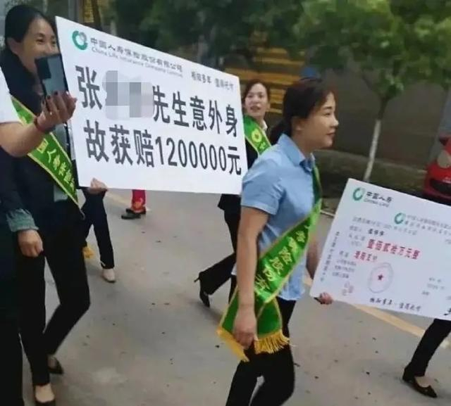 在网上曝出的照片里,几名据称是中国人寿的工作人员,举着写有“张某某先生意外身故获赔1200000元”的牌子和放大了的保险单,在大街上招摇过市。所有人身着工服、肩披绶带、面带微笑,敬业精神十足。