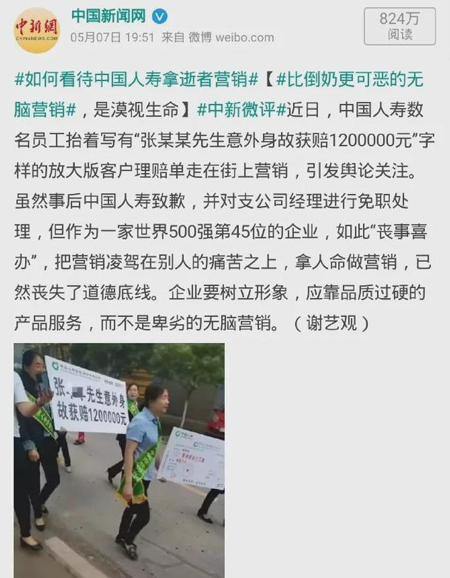 中国人寿这一波宣传行为的另一个槽点在于:消费逝者,把因意外去世的张先生当成噱头,这是对生命的漠视,乃至践踏。拿人命搞营销,首先就触动了舆论上的禁忌。