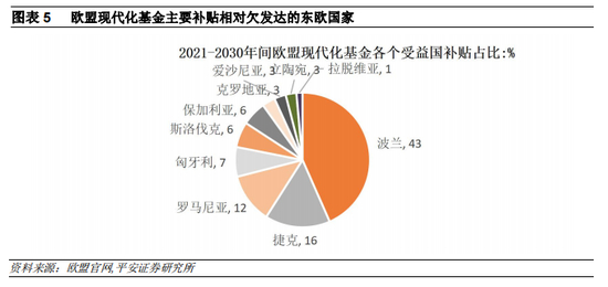 现代化基金是一项专门的资金计划,旨在帮助能源系统实现现代化并提高能源效率,支持10个低收入欧盟成员国碳中和目标的实现(图表5)。现代化基金主要包含以下几方面投资:1)可再生能源的生产和使用;2)能源效率的提高;3)能源储备系统的建设;4)能源网络的现代化,包括区域供暖、管道和电网等;5)碳依赖地区的公平过渡,涉及劳动力的安置、低碳相关技能的提升、教育以及初创企业的支持等。现代化基金的资金来源主要包括欧盟碳排放交易系统(EU ETS)2021-30年总配额拍卖中2%的收入,还包括少许波兰等受益会员国向现代基金转入的额外补贴。据欧盟测算,2021-2030年现代化基金的总收入可能达到140亿欧元,其中由受益会员国向现代基金转入的补贴约在6.43亿,占比4.6%。