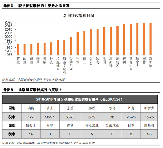 而碳税实施相对困难。仅有芬兰、瑞典等为代表的北欧国家开征较早,实施也较为坚决(图表8、图表9)。欧盟主要经济体中,法国碳税开征过程一波三折,2010年提出的碳税法案胎死腹中,到2014年才成功引入,2019年又被取消。2012年欧盟决定对所有进出欧洲国家机场的航班征收碳排放税,但一经推出就受到联盟内部主要国家和外部美国等国的激烈反对。碳税实施效果差异较大。Wiepke(2006)发现碳税实施之初取得了一定的减排效果,如芬兰在1990-1998 年间,有效抑制约7%的二氧化碳排放量;在爱尔兰,碳税与能源税相比,碳税减排效果更明显,且碳税极大地刺激了可再生能源的使用。但是Bruvoll(2004)发现挪威自1991年征收碳税仅减少了2%的二氧化碳排放量,主要由于挪威考虑本国企业竞争力,对工业企业有碳税豁免、减免。