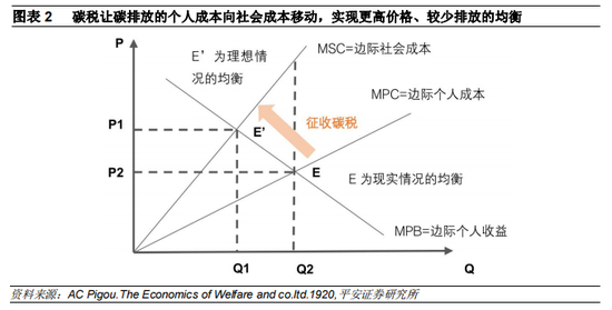 基于不同的经济理论视角,财政政策支持碳中和依赖不同的传导路径和一揽子政策工具(图表1)。基于不同经济学思想,财政政策至少可以从以下几个方面发力:1)新古典经济学的“庇古均衡”。马歇尔在《经济学原理》中首次提出了“外部经济”的概念,庇古针对外部性问题提出了征收“庇古税”的方法,征收碳税类似于“庇古税”,使得边际个人成本向边际社会成本移动,从而实现较高成本下、更少碳排放量的均衡(图表2)。2)凯恩斯主义的绿色“总需求管理”。根据凯恩斯主义的理论,可通过支出、补贴等财政手段创造有效需求,刺激绿色经济发展。马骏认为,疫情过后,我国将有大量资金投入到基础设施和消费项目,这些投资项目和消费刺激措施对未来的环境和碳排放将产生重要和长远的影响。3)熊彼特的“破坏性创造”。根据熊彼特的创新理论,创新有助于实现经济结构的调整,而碳中和过程既是能源结构的变迁,也是产业、经济结构的变革,需要加大公共研发投入,并发挥财政的转移支付功能,为技术变迁保驾护航。