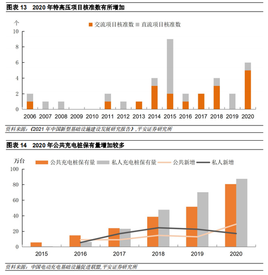 二是,加大相关产业的基建投资,为能源、产业转型创设有利条件。“新基建”七大领域中,特高压和充电桩同“碳中和”有直接关系,特高压是解决我国风电、光伏资源分布和消费分布不匹配的重要技术手段(图表12);充电桩建设是现阶段我国新能源汽车发展的主要矛盾之一。2020年3月,中共中央政治局常务委员会召开会议提出加快新型基础设施建设进度。2020年全年特高压项目核准数有所增加,为“十三五”期间各年份最高,2020年公共充电桩的保有量也有大幅增加(图表13、图表14)。为加快疫后复苏,各国顺势推行“绿色新政”、“绿色基建”。绿色基建作为当前国家重点支持的“两新一重”和“双循环”建设的重要着力点,符合当前我国经济转型升级方向,也能成为疫后复苏的一大增长引擎。除了特高压、充电桩外,海绵城市、绿色建筑、绿色市政等领域也存在基建投资的发力点,后续财政有望加大对这些领域的支持力度。
