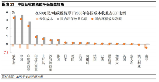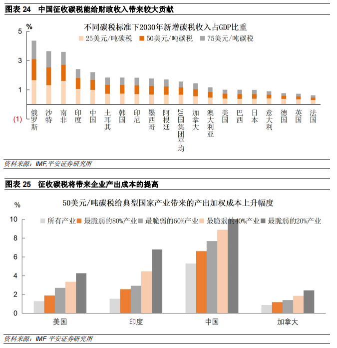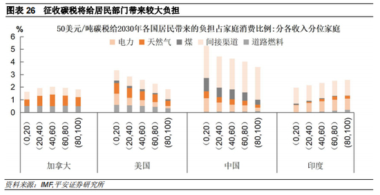 IMF的分析表明若中国征收碳税,或将取得不错的效果。一方面是减排效果好,根据IMF的测算,若征收50美元/吨的碳税,在主要国家中,2030年中国征收碳税的国内环保净收益将达到GDP的3.1%,将仅次于俄罗斯的3.3%,处于较高水平(图表23);另一方面是增收效果还不错,在不同碳税标准下,中国征收碳税给财政收入带来的贡献也将居于主要经济体前列(图表24)。但中国征收碳税将给企业和家庭部门带来较高成本,对社会公平的影响较大。中国征收50美元/吨碳税给产业带来的加权平均成本远高于美国、印度、加拿大,且钢铁、金属等部门成本的上升幅度接近10%,这将削弱我国工业企业的竞争力(图表25)。若考虑欧盟对我国实行碳边界调整机制,我国出口到欧盟的产品或将面临更高成本。此外,碳税给我国居民带来的负担也较高,尤其是处于低收入分位的家庭受到的冲击更大(图表26)。