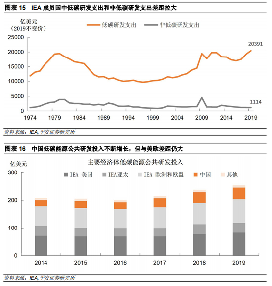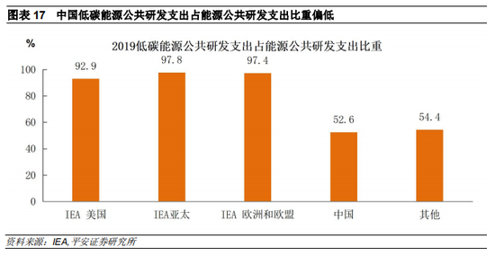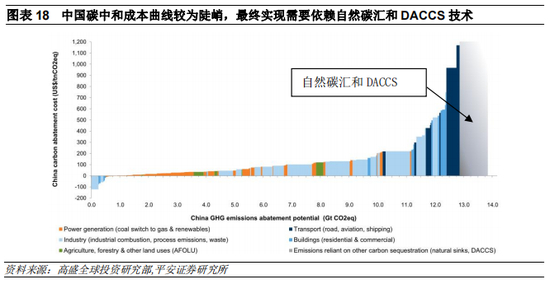 三是,加大碳中和相关领域公共研发投入,提前布局核心关键技术。根据IEA的数据,近年来低碳研发支出和非低碳研发支出的差距正在不断拉大,说明各国对低碳技术重视程度不断提高(图表15)。中国的低碳能源公共研发支出也在不断提高,但与欧盟、美国比,中国低碳能源研发支出占总研发支出的金额和比重均明显偏低,需进一步增加低碳能源公共研发支出,优化能源研发支出结构(图表16、图表17)。根据高盛的测算,跨越75%脱碳水平之后中国的脱碳成本曲线将极为陡峭,最终实现碳中和有10%的碳排放必须依赖自然碳汇和直接空气碳捕获与封存技术(DACCS)(图表18)。自然碳汇指通过植树造林、植被恢复等措施,吸收大气中的二氧化碳;DACCS技术指直接从空气中捕获二氧化碳来减少碳排放。这些技术路径外部性强、成本高,企业投入的积极性有限,需要政府加大研发投入,降低脱碳成本曲线的斜率,吸引社会资本进来。