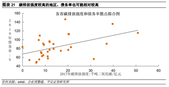 从地区来看,部分地区财政收入或面临一定冲击,可能衍生债务风险。以煤炭大省山西为例。2019年仅煤炭开采和洗选产业主营业务税金及附加就占到了工业企业主营业务税金及附加的75.2%,占到了山西省一般公共预算收入的22.5%,2014年前的数据也显示山西这两项占比大幅高于同期全国水平,如果算上其它产业中与煤炭相关的部分,这一比重将更大(图表20)。此外,各省碳排放强度与债务率存在一定正相关关系,高耗能、减排难度较大的地区财政可持续性通常也相对较弱,“碳中和”减收增支的冲击下,地区财政状况的恶化可能波及当地国企、城投融资能力,触发债务风险(图表21)。尽管“碳达峰、碳中和”目标的实现是一个长期的过程,但政策导向下,市场化金融支持的后撤可能会以较快速度展开。考虑到这些地区对资源依赖程度较高,经济转型难度较大,依靠自身有限的财力难以支撑能源结构、产业结构调整,需要政府加大转移支付力度予以扶持。