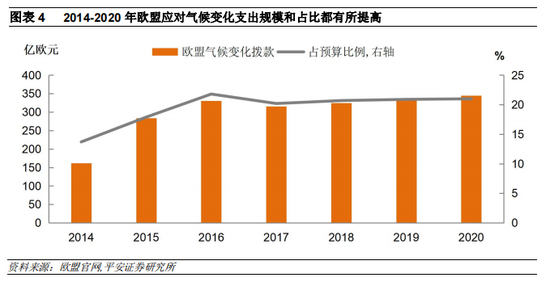 欧盟的长期预算也被称为多年度财政框架(MFF),是为实施欧盟年度预算提供的稳定框架,规定了欧盟主要的政策优先事项,并转化为为期数年的财政条款,现阶段欧盟以7年为一个长预算周期。在上一个欧盟长期预算周期(2014-2020)中,气候行动所需资金就已经整合进去。2014年到2020年间,应对气候变化的相关支出从161.7亿欧元提高到了342.5亿欧元,占欧盟总预算比例从13.7%增长到了21%,2014-2020年应对气候变化支出总占比为19.7%(图表4)。下一个欧盟长期预算周期(2021-2027),气候行动相关支出占比还将继续增加。2020年5月,欧盟委员会提出了2021-27年欧盟长期预算的修订提案,至少25%的欧盟预算支出将用于2021-2027年的应对气候变化相关行动。欧盟委员会于2021年2月24日通过了新的欧盟适应气候变化战略,并明确将这一战略纳入财政政策框架。