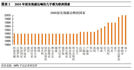 欧盟在碳达峰、碳中和的道路上走在世界前列,欧盟财政政策支持碳中和有丰富的经验。根据2017年的世界资源研究所(WRI)发布的报告,2000年前实现碳达峰的绝大部分是欧洲国家(图表3)。早在20世纪90年代初期,欧盟的一些国家如芬兰、丹麦、瑞典、荷兰等就率先引入了碳税,欧盟预算框架中也早已将气候变化因素纳入。梳理欧盟财政政策支持碳中和经验的意义在于:一方面,同中国一样,欧盟内部也存在较大的区域差异,这既表现在经济发展水平上,也表现在能源结构、产业结构上,这是财政政策设计必须考虑的问题;另一方面,欧盟支持碳中和财政政策工具存在跨区域的溢出效应,这对我国政策制定的影响也是个值得思考的问题。