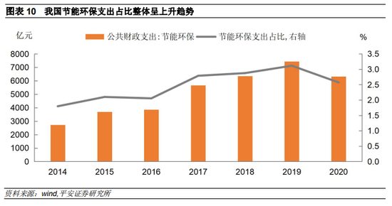 我国并不是没有能同应对“碳中和、碳达峰”任务相衔接的资金,只是相关预算的整合程度不够,支出相对碎片化。一般公共预算支出中,节能环保支出(与能源效率相关)总金额从2014年的2726亿元提高到2019年的7444亿元,占比从2014年的1.8%提高到2019年的3.1%,2020年由于疫情期间民生支出力度较大,这一比重才回落到2.6%(图表10)。专项债投向中,根据企业预警通的统计,2020年专项债中生态支出1723.2亿,占2020年新增专项债额度的4.6%。在2021年财政预算草案中,与碳中和目标直接相关的支出安排包括:大气污染防治资金(与减少碳排放相关)安排275亿元,增长10%;重点生态区功能转移支付安排(与生态系统碳汇相关)882亿元,增长11%。若将财政支出中碳中和相关科研经费、地方绿色化改造资金等也予以纳入,预算中的“含绿量”或将进一步提高。如南昌高新区从2021年开始每年列支绿色发展专项资金1000万元,专项用于扶持企业节能技改、清洁生产、循环利用、生态文明建设等。