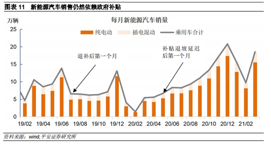 当前新能源汽车销售对财政补贴仍然存在一定依赖:2019年6月26日之后,新能源国家补贴力度降幅超过50%、地方补贴取消,新能源乘用车销售自7月起就呈现了大幅下滑;2020年4月,国家考虑到疫情对于国内经济的冲击,对新能源汽车补贴政策采用逐步退坡的方式,补贴延长至2022年底,随后新能源车销量便持续大幅增长(图表11)。欧盟国家在支持新能源发展过程中也运用了财政补贴手段,如去年5月,法国宣布80亿欧元汽车产业援助计划,给购买电动车个人消费者的政府补贴从6000欧元提高到7000欧元。中国新能源汽车还处于发展阶段,保持一定支持力度是必要的,但为避免补贴泡沫出现,财政资金应当向拥有核心技术的厂商倾斜,实现精准扶持。