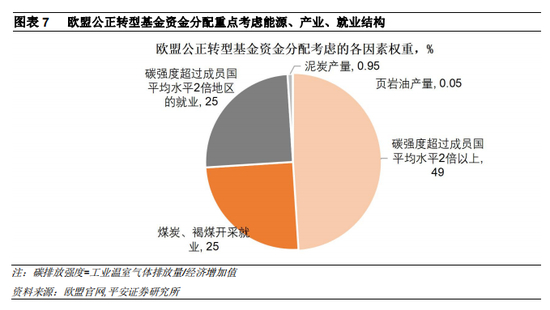 这一计划包括三大支柱:1)公正转型基金(Just Transition Fund)。公正转型基金的资金主要由欧洲区域发展基金(ERDF)和欧洲稳定基金(ESF)调入(两者均来源于欧盟预算,为财政专项支出),规模在300亿-500亿欧元之间,以地区受到能源转型冲击程度为标准确定地区资金分配方案,其中工业碳排放强度以及煤炭开采就业占据较大比重,聚焦产业升级的难易程度和地区就业稳定(图表7)。2)“投资欧洲”下的专门计划。“投资欧洲”下的专门计划重点支持能源、基础设施脱碳相关项目。3)与欧洲投资银行合作的公共部门贷款机制。公共部门贷款机制中,欧盟采取利率补贴等政策,激励欧洲投资银行向碳中和相关领域提供贷款。