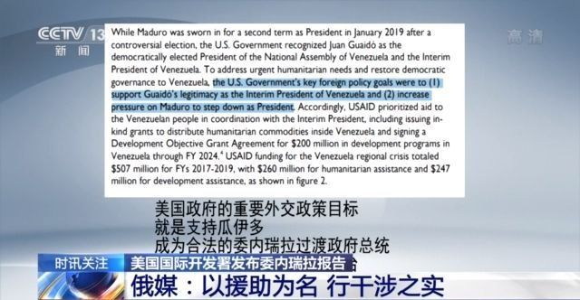 这份报告写到:美国政府的重要外交政策目标就是支持瓜伊多成为合法的委内瑞拉过渡政府总统,并对马杜罗加大施压逼他下台。而美国国际开发署的首要任务是确保把物资提供给支持瓜伊多的委内瑞拉人民。2019年1月和2月,美国政府将美国国际开发署提供给委内瑞拉人的援助物资,认定为加强对瓜伊多过渡政府支持和施压马杜罗的“关键工具”。然而对于报告中这些赤裸裸干涉委内瑞拉内政的关键内容,西方主流媒体几乎全部“噤声”,视而不见。