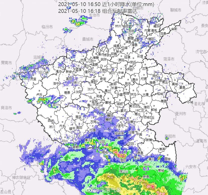 信阳市气象台2021年5月10日16时35分发布冰雹橙色预警信号:预计浉河区、平桥区、罗山、息县、光山、潢川、淮滨和固始未来3小时内将出现冰雹天气,并可能造成雹灾。信阳市应急局、信阳市水利局联合提醒:注意防范。
