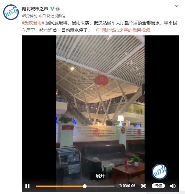 据湖北城市之声微博,有网友爆料称,“暴雨来袭,武汉站候车大厅整个屋顶全部漏水,半个候车厅里,被水泡着,目前漏水停了。”