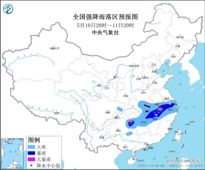 根据最新气象资料分析,5月10日至13日湘中及以北地区有一次暴雨到大暴雨过程,并伴有短时强降水、风雹等强对流天气,致灾风险高。