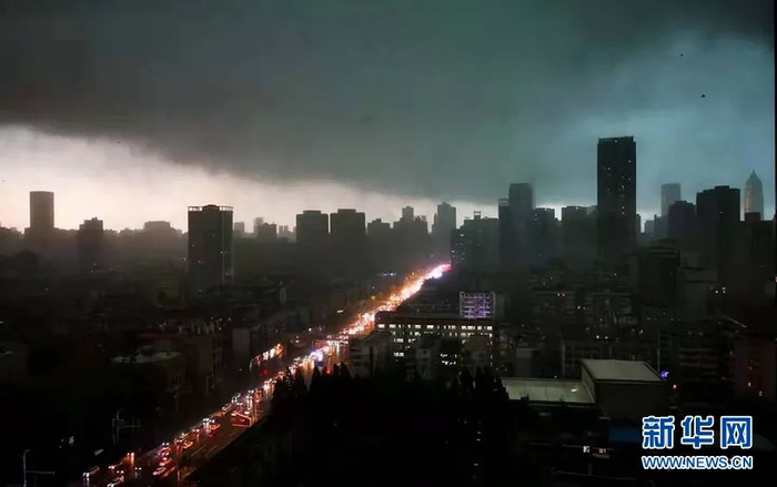 10日下午2点的武汉,原本还是白昼的天空,秒变黑夜,公路两旁的路灯都全部打开了,正午如同夜晚一般。