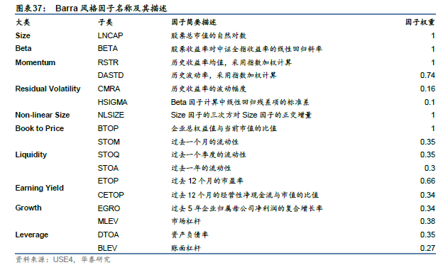 基础的Barra模型包含十个风格因子,其具体定义如下: