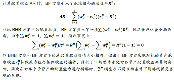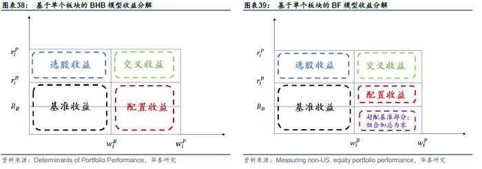 相比之下,更早之前由Brinson和Fachler(1985)提出的BF模型着重强调了基准指数的收益因素。从结果上看,BF模型将内部板块相对指数的超额收益代替板块绝对收益,强调了超额收益的意义。若站在组合全局的角度上看,BF模型右下角部分的加总为0,并不会产生实际影响;但在针对板块分析的时候,板块的溢价有更强的诠释意义。