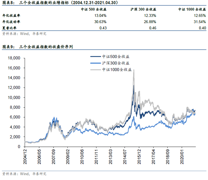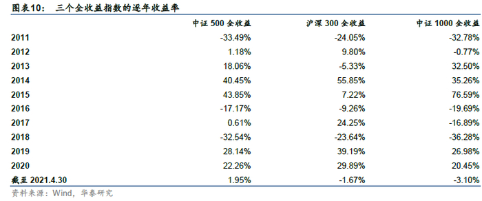 我们将中证500与另外两个主流宽基指数沪深300和中证1000进行对比。自基期以来,中证500全收益指数年化收益率为13.00%,过去5年的收益表现介于沪深300和中证1000之间。2021年以来中证500全收益指数表现最好。
