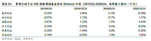 从整体来看,基金在2019年12月出现小幅回撤,在其余观测区间均获得超额收益;从具体分解来看,基金的选股效应均对超额收益贡献突出且稳定,在各期均提供了正向的超额收益;相对而言,配置效应和交叉效应对组合超额收益的贡献偏低。总体来看,景顺长城中证500指数增强基金的选股能力较为突出。