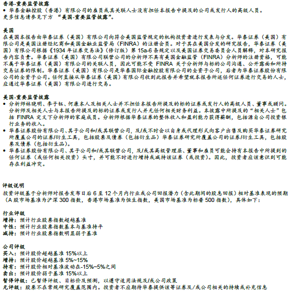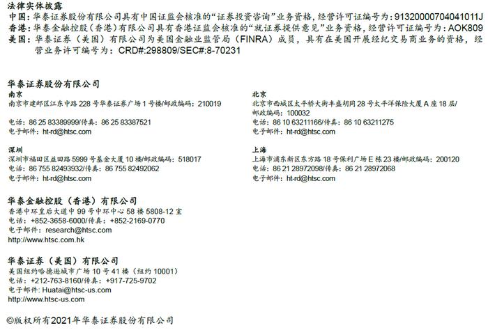 在任何情况下,本公众号中的信息或所表述的意见均不构成对客户私人投资建议。订阅人不应单独依靠本订阅号中的信息而取代自身独立的判断,应自主做出投资决策并自行承担投资风险。普通投资者若使用本资料,有可能会因缺乏解读服务而对内容产生理解上的歧义,进而造成投资损失。对依据或者使用本公众号内容所造成的一切后果,华泰证券及作者均不承担任何法律责任。