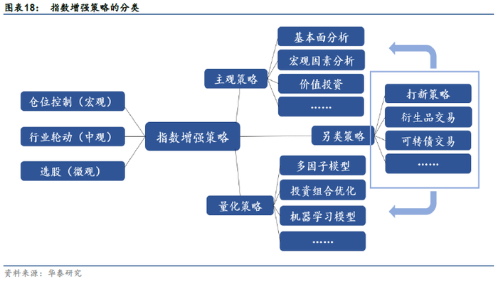指数增强方法包括仓位控制、行业轮动与选股等方面。基金仓位控制基于投资人对市场环境进行判断并进行择时,行业轮动源于对不同行业的分析,选股则基于对个股质地的甄选;三种方法分别对应了资产配置的宏观、中观和微观三种视角。