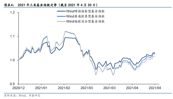 在2019年和2020年的“抱团”行情中,公募主动权益类基金业绩优秀,跑赢了公募指数增强基金。2021年春节后市场大幅震荡,前期抱团严重的股票出现较大幅度回撤,此时公募指数增强基金展现出了其在震荡市中优势。由下图可知,Wind增强指数型基金指数在春节后的回撤幅度明显小于Wind普通股票型基金指数和Wind偏股混合型基金指数,2021年(截至4月30日)Wind增强指数型基金指数收益表现最好。