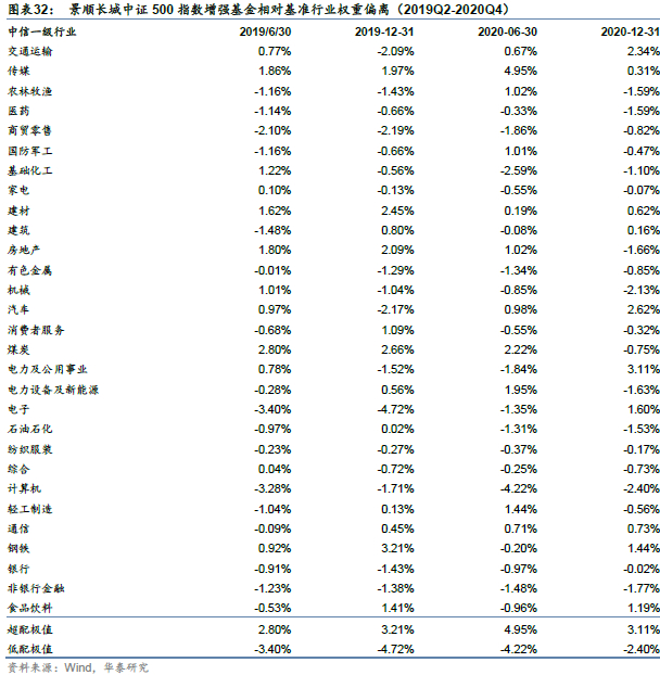 我们进一步以中信一级行业分类为标准,对比同期基准中证500指数的行业分布。可以看到,景顺长城中证500指数增强基金相对基准的行业偏离不超过±5%,大部分行业偏离控制在±1%左右,对行业相对偏离的控制较为合理;以2020Q4的报告期披露为例,基金在电力及公用事业、汽车和交通运输等板块相对超配,在机械、计算机等板块相对低配。