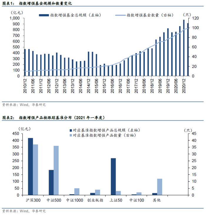根据Wind的指数增强分类标签统计,截至2021年一季度,国内市场共有99只指数增强型基金,总规模约为913亿元。从基准指数的划分来看,跟踪沪深300和中证500指数的指数增强型基金在产品数量上占据主要比重,是当前指数增强产品中的主流。其中,以沪深300为基准的产品共计37只,总规模约为417亿元;跟踪中证500的指数增强产品共计36只,总规模约为184亿元。从市场分布来看,以沪深300和中证500为基准的指数增强型基金值得重点关注。