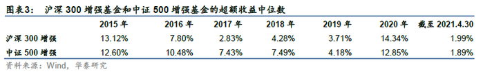 我们分析两类主流指数增强基金(沪深300增强和中证500增强)的超额收益情况。如下表所示,2015年以来,沪深300增强基金和中证500增强基金的超额收益中位数都为正,说明整体来看公募指数增强基金具有获取超额收益的能力。