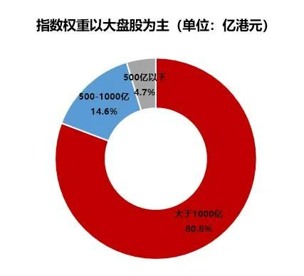 从具体数据来看恒生科技指数的成份股总市值大于1000亿港元的大盘股权重占比80.8%,市值500亿港元以下成分股合计权重不足5%;成分股平均市值达6022亿港元,也就是说恒生科技指数是一个大盘科技指数。