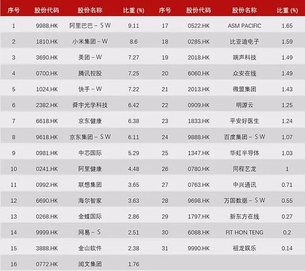 比如下图是根据2021年5月5日恒生指数公司官网公布数据制作的最新的恒生科技指数权重表,阿里巴巴与小米集团的权重就已经超过8%,下一次季度调整中将会调整到8%。