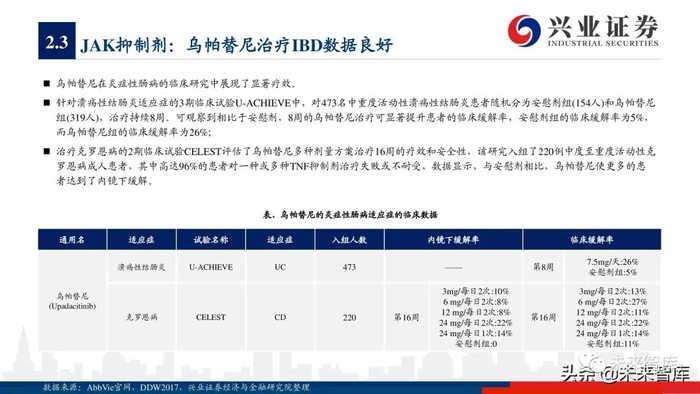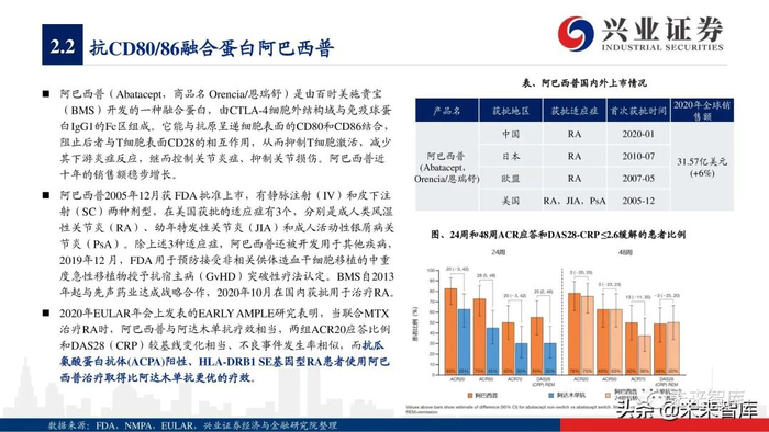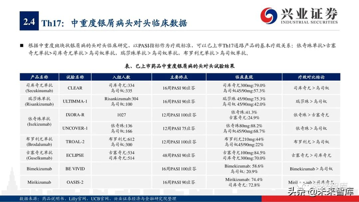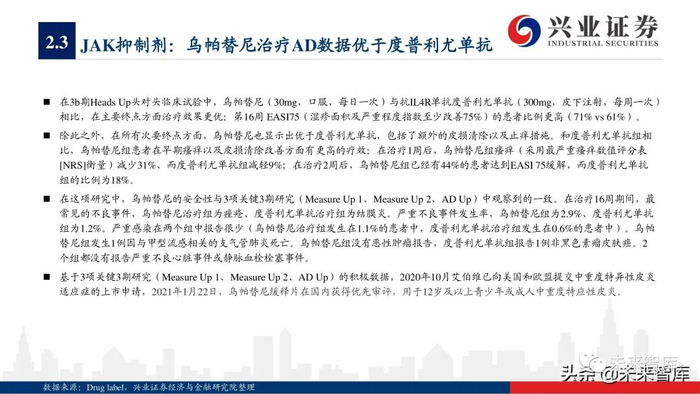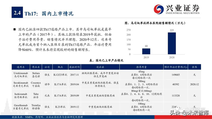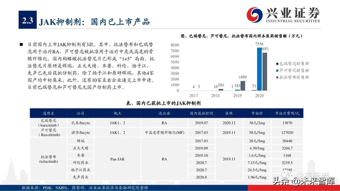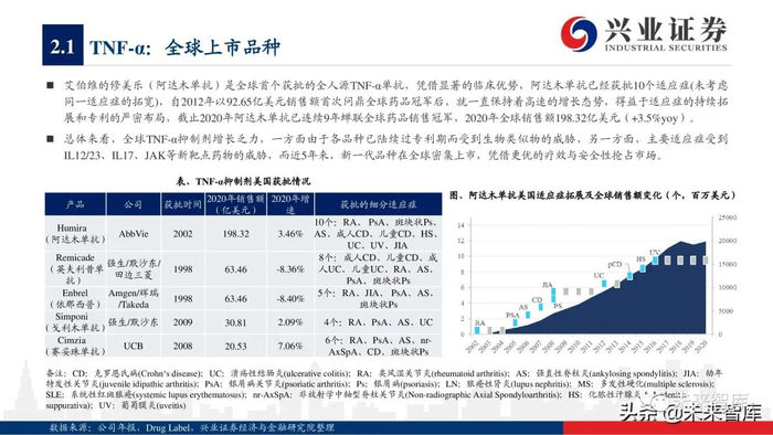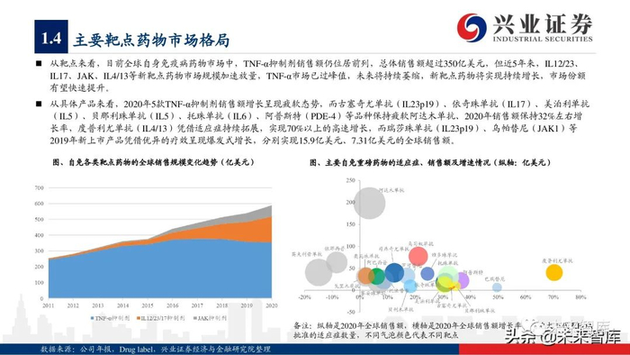 从具体产品来看,2020年5款TNF-α抑制剂销售额增长呈现疲软态势,而古塞奇尤单抗(IL23p19)、依奇珠单抗(IL17)、美泊利单抗 (IL5)、贝那利珠单抗(IL5)、托珠单抗(IL6)、阿普斯特(PDE-4)等品种保持疲软阿达木单抗、2020年销售额保持32%左右增 长率,度普利尤单抗(IL4/13)凭借适应症持续拓展,实现70%以上的高速增长,而瑞莎珠单抗(IL23p19)、乌帕替尼(JAK1)等 2019年新上市产品凭借优异的疗效呈现爆发式增长,分别实现15.9亿美元、7.31亿美元的全球销售额。