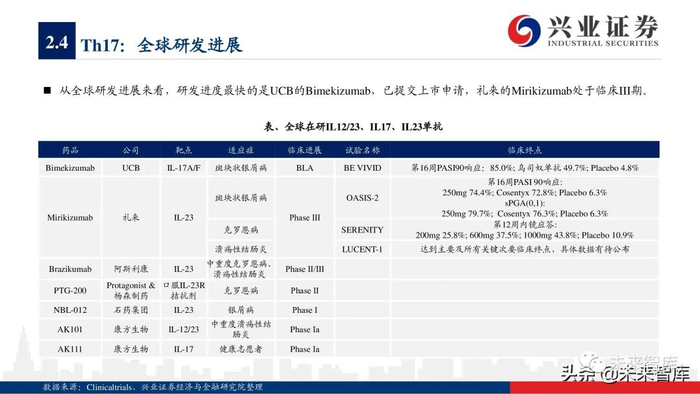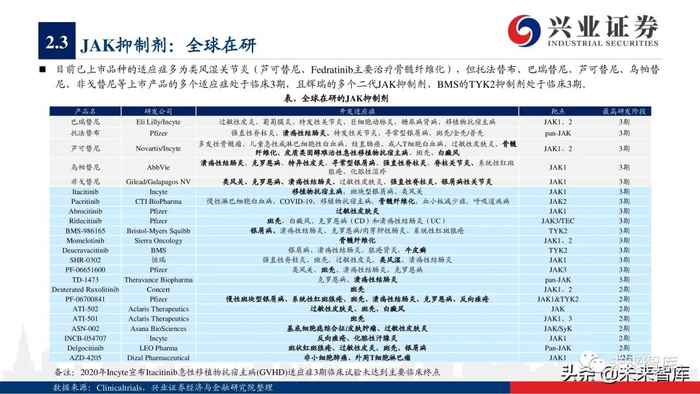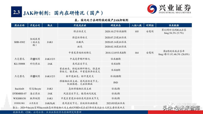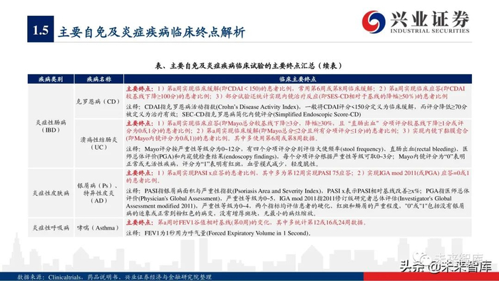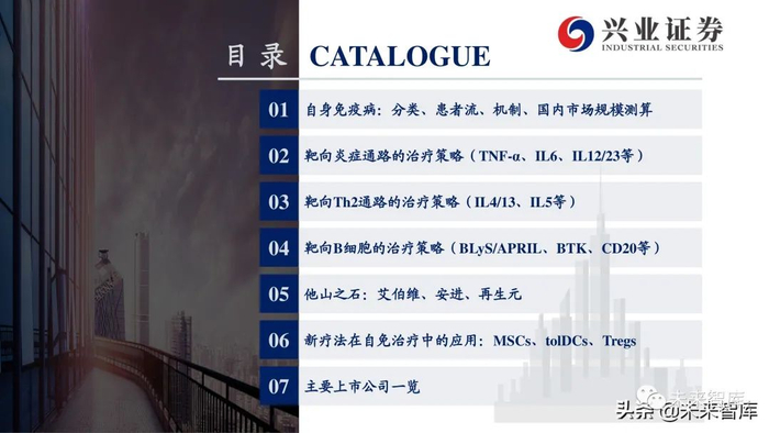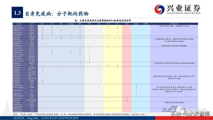 本报告主要分析了常见自身免疫病(包括关节脊柱炎、银屑病、炎症性肠病、系统性红斑狼疮、支气管哮喘等)的核心靶点,对行业未来的研发 趋势进行了展望,并选择了全球市场的3个头部玩家作为典型案例,最后讨论了国内自身免疫病领域的主要上市公司。限于篇幅,本报告并未系统 性讨论移植物抗宿主病、多发性硬化症、重症肌无力、 1型糖尿病、干燥综合征等免疫疾病。