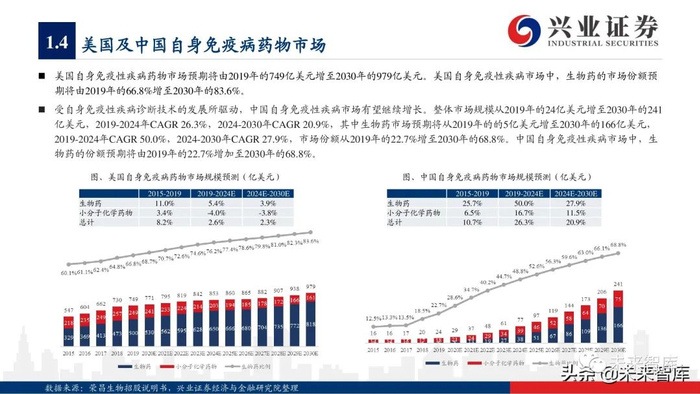 美国自身免疫性疾病药物市场预期将由2019年的749亿美元增至2030年的979亿美元。美国自身免疫性疾病市场中,生物药的市场份额预 期将由2019年的66.8%增至2030年的83.6%。