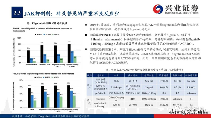 非甾体抗炎药(nonsteroid anti-inflammatory drugs,NSAIDs):治疗关节类自身免疫病的常用药物,能有效减轻患者临床症状和体征,消 除关节局部炎症反应,但是该类药只能治标不能治本,不能控制疾病的活动及进展。NSAIDs共有的不良反应包括中枢神经系统症状、心 血管损害、胃肠道症状、造血系统改变、肝肾功能不全、哮喘和皮肤药疹等。继阿司匹林之后,众多NSAIDs被研发用于临床。 SAIDs:糖皮质激素起效快,可用于控制急性期病变,可减少T淋巴细胞、嗜酸性粒细胞和单核细胞, 抑制白介素合成和释放,降低补体 和免疫球蛋白,是关节类、IBD、SLE、LN等基础药物,常与传统DMARDs药物联合应用。但糖皮质激素不良反应多,停药后会复发, 目前临床多主张与其他免疫抑制剂联合使用。