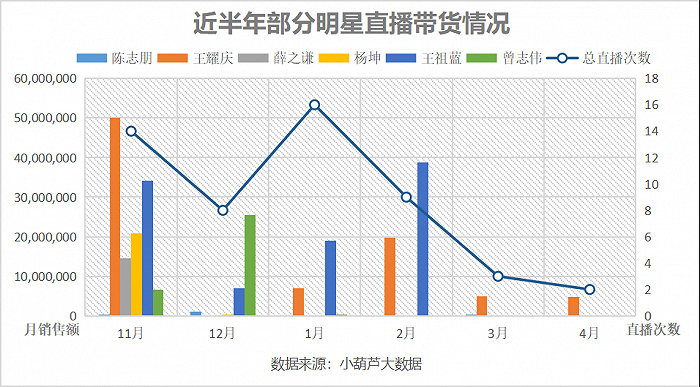 腰部明星直播的次数骤减,大部分已经消失在直播间了。小葫芦大数据显示,从2020年11月至2021年4月,多位明星直播带货的次数陡然下降,以王祖蓝、薛之谦、陈志朋、王耀庆、曾志伟、杨坤六位为例,大多数明星没能坚持到今年2月,累计直播次数从巅峰时期的十多次降到4月份的2次。