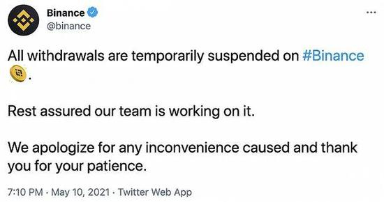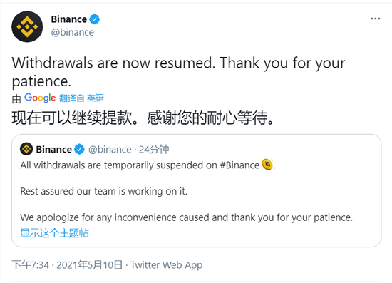 5月10日晚7点34分,币安更新状态称,所有提款已恢复。