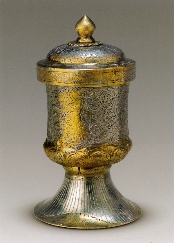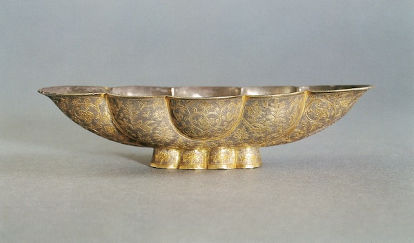 图34 鎏金花鸟纹银制八曲长杯 唐 8世纪 日本奈良县立橿原考古学研究所附属博物馆藏