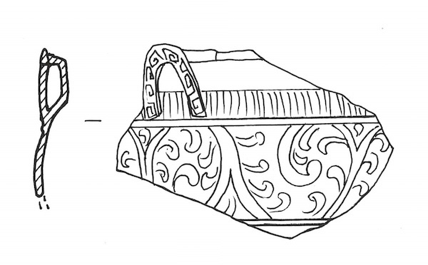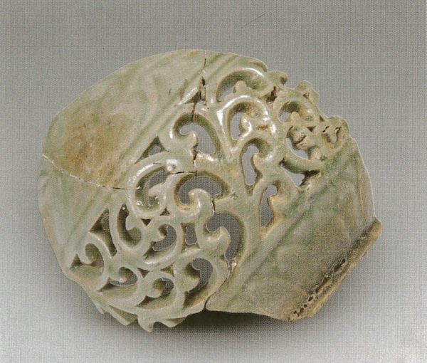 另一方面,浙江省寺龙口越窑青瓷香炉(D型)炉身阴刻报告书所谓“卷草纹”(图6),或熏炉炉盖的镂空装饰(图7),以及套瓶之外瓶瓶身也常以此类纹样为饰(图8)。此外,河南省宝丰清凉寺北宋汝窑窑址也出土了装饰着同类纹样的镂空熏炉(图9),而“袭故京遗制”于浙江省杭州开窑烧瓷的南宋官窑老虎洞窑址亦见青瓷套瓶(图10)。虽然宝丰清凉寺汝窑是否即北宋官窑,目前已无从证实,不过从南宋人陆游《老学庵笔记》“故都时,定器不入禁中,惟用汝器”的记载,汝窑制品曾进入宫廷器用一事应无疑义,至于老虎洞窑官窑青瓷标本另可据伴出的带“修内司窑置”等字铭荡箍,得知其或为文献中的修内司窑。这也就是说,本文所拟讨论的这类看似形式化的唐草纹样,既是中国民间瓷窑所爱用的纹饰,同时也受到宫廷消费者的青睐,所以可以说是受到官方以及民间喜爱的时尚纹饰。