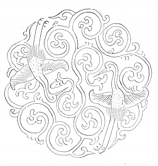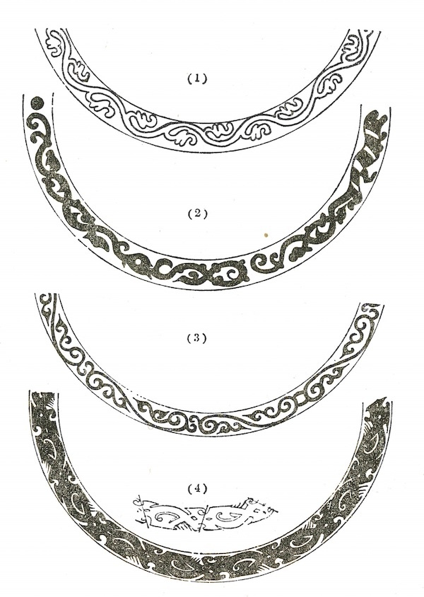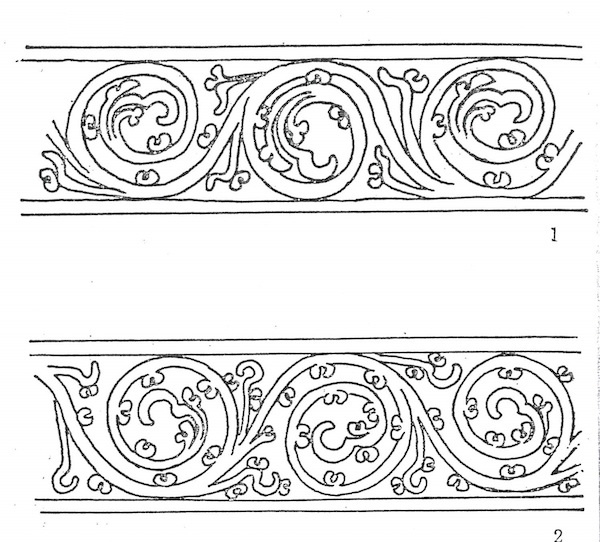 虽然,就外观形态而言,见于铜镜镜背外区边缘的连续波状纹饰似乎和发源于西方的唐草纹相近(图35),而其中所谓流云纹也和《营造法式》图绘的龙牙蕙草有相近之处,不过20世纪30年代长广敏雄在详细研读里格尔(Alois Riegl)关于唐草纹传播名著《美术样式论》(Stilfragen: Grundlegungen zu einer Geschichte der Ornamentik, 1893)的诸多案例后,得出结论认为汉镜所见这类波形连续起伏的纹样是完全不同于唐草纹的另一装饰系统,其无宁是承袭了战国时代以来蟠螭纹的形式,可以说是直接源自战国样式的虺龙纹。到了50年代,长广在他和水野清一编著的大作《云冈石窟》也以云冈石窟为例,明确指出西来的半棕叶唐草纹是出现于5世纪前半。就笔者的见闻,时至今日除了少数学者曾提示汉镜所见“唐草纹”也有可能是受到西域传入的半棕叶唐草纹的影响的说法之外,学界一般都倾向认为中国唐草纹是在5世纪时由中亚传入的。